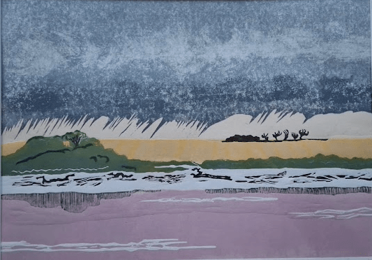 Valma Cairns is a printmaker who specialises across a range of printmaking mediums. Her work shown on this listing includes: “Storm breaking over direl. Lake Tyrell’ and ‘Mallee Silos’. Lea Casey’s print shows a landscape linocut print from 2025. Each print demonstrates the ‘reduction linocut’ technique.