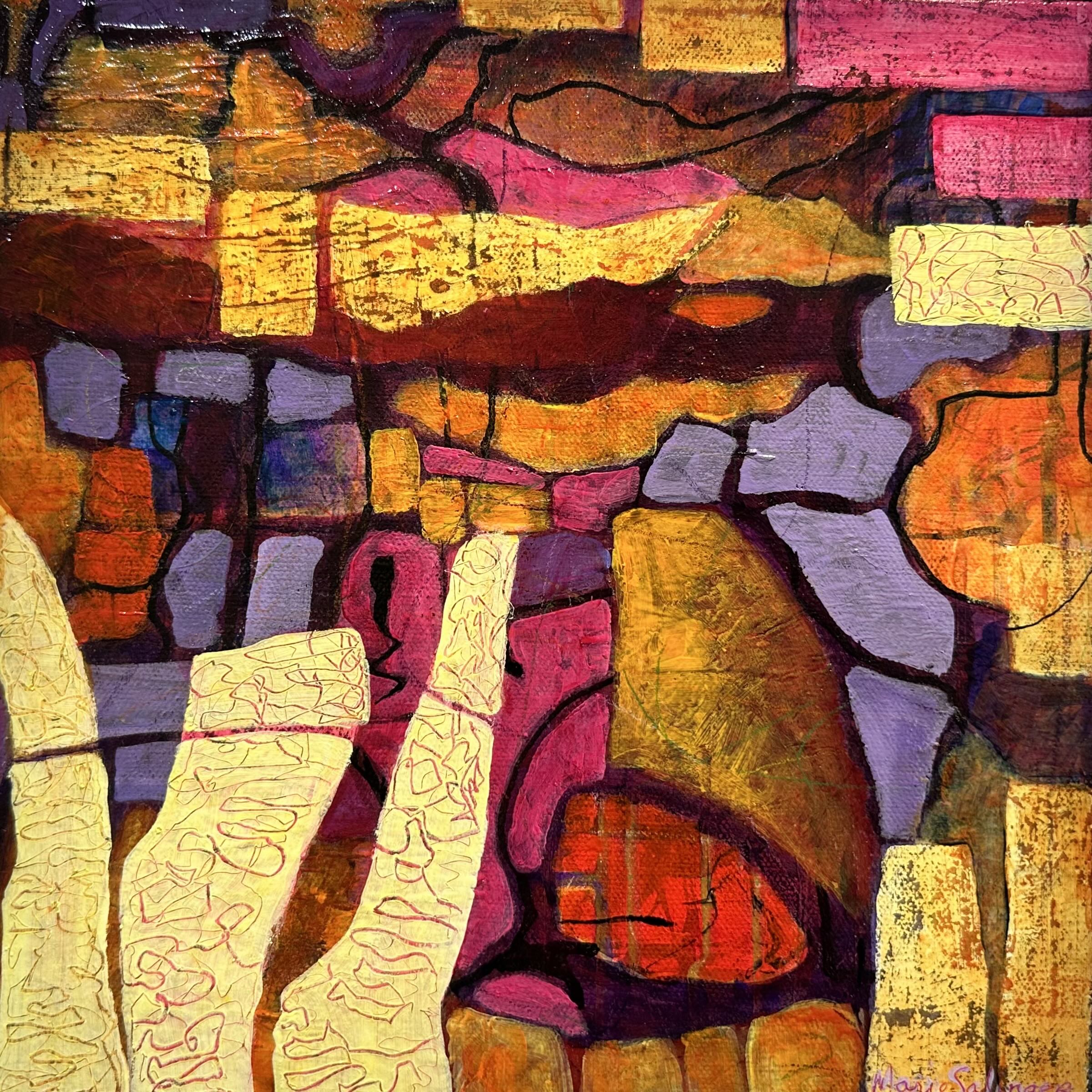 Many of her paintings incorporate monoprints created using found objects from the local environment.This incorporation of prints made in situ and with natural objects forms a link in the works to actual times and places. Expressive organic lines are overlaid with heavily textured areas of paint and the surface of the painting is then worked back into, scraping, sanding and etching to reveal what lies beneath. The surface of the work is of primary importance and aims to convey a sense of time passing and fleeting memories. The works invite the viewer to be still and to contemplate what might be just below the surface.